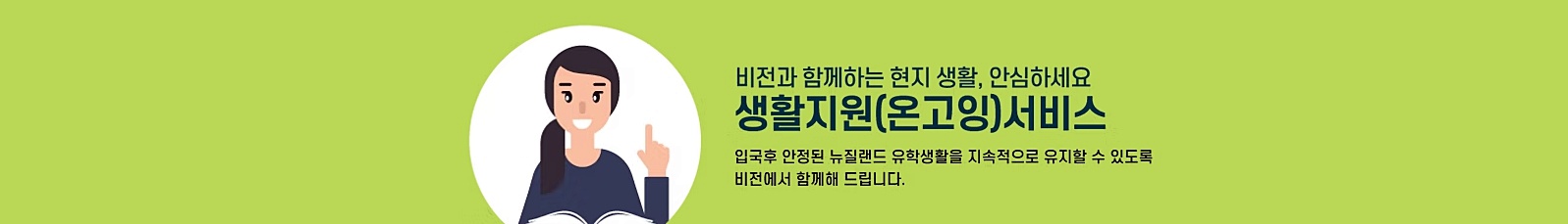 비유학원의 생활지원 서비스는 정착후 고객이 유학 생활을 하는 기간동안 안심하고 체류할 수 있도록 진행되는 Ongoing 서비스 입니다.