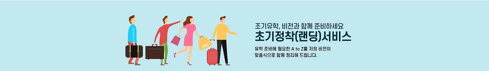 초기 정착(랜딩) 서비스 _조기유학, 비전유학원과 함께 준비하세요. 비전유학원은 복잡한 유학 준비와 초기 정착 과정이 부담이 되지 않도록, 처음부터 끝까지 곁에서 함께하는 든든한 파트너가 되어드립니다. |